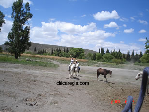 Fuimos al centro de Parras a pasearnos y además dentro de las instalaciones del hotel montamos a caballo. En la foto de abajo salgo levantando el brazo, ahí a lo lejos, es que le estaba haciendo como los vaqueros, pero me tomó la palabra el caballo ¡y que empieza a galopar!, como no sé mucho de montadas, el señor que iba cuidándome, me gritaba que abrazara al caballo con las piernas. Termine con dos moretones y un dolor de piernas. Ahora sé por qué los vaqueros caminan así de raros.