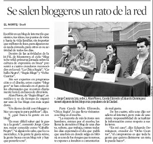 El evento que sirvió de plataforma para darnos a conocer los Bloggers Regios, fue la pasada Feria Internacional del Libro 2006, organizada por el ITESM, en el cual dos colegas blogger, se pusieron las pilas e involucraron en el evento una serie de Mesas de Discusión con temáticas variadas de los Blogs. A esto se ligó una cobertura por la prensa, como este artículo de MILENIO y otras como ésta de EL NORTE y ésta otra realizada a la última Mesa de Discusión, el cual pueden leer aqui: