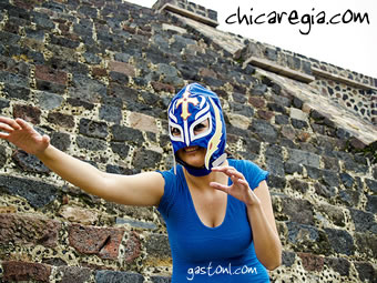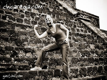 En Teotihuacan, Gaston me tomó fotos con la máscara de Wolver del Rey Misterio Jr.