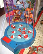 el jueguito era de bolsillo y tenías que darle cuerda para que los pecesitos dieran vueltas y abrieran y cerraran la boquita para poder pescarlos. !Ese jueguito era un hit!