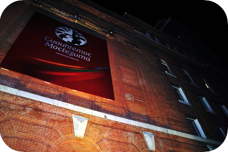 La nueva imagen de Cuauhtémoc Moctezuma, estaba escondida bajo una manta en las grandes paredes del edificio. Fué develada seguida de un show de personas en cuerdas que bajaban del techo del edificio.
