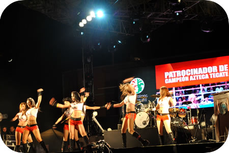 Tampoco podían faltar las modelos representativas de las cervezas, amenizando con bailes y premios a los invitados. Que por cierto, las chavas de la cerveza Sol aventaron discos voladores y me tocó pescar uno, y venía con el premio de boletos para ir a ver a Miguel Bosé. ¡¡¡Aaaahhhh!!!