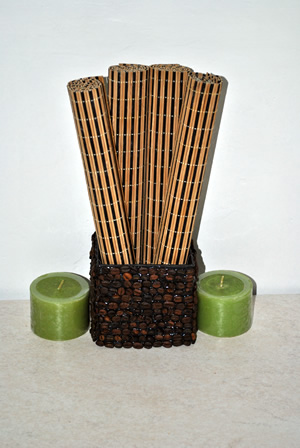 En mi área de desayuno, hice un contenedor para mis mantelitos de bambú, para tenerlos a la mano. Es como el que habí­a hecho para mi comedor pero en chiquito. Se ve muy lindo.