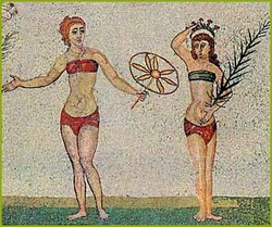 La primer evidencia que se tiene de los bikinis está en los mosaicos romanos de Sicilia donde aparecen unas gimnastas vestidas en dos piezas, ya que era la ropa deportiva de la época.
