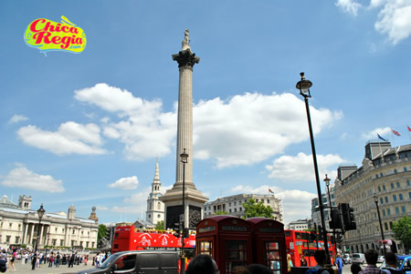 Se le llama Trafalgar debido a que los ingleses ganaron la batalla del mismo nombre contra los españoles y franceses. Un monumento que recuerdo mucho haberlo visto en la caricatura de Candy, es el que tiene leones en la base, se llama Columna de Nelson, Horatio Nelson fué un almirante que murió en la Batalla de Trafalgar.