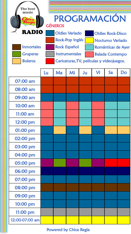 Y a partir del próximo miércoles 14 de septiembre, iniciará la nueva programación de música. Y la distribuí de esta manera: